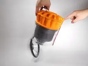 После освобождения всех выступов потяните фильтр от оранжевой сборки циклона, чтобы снять его с бака.