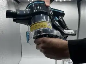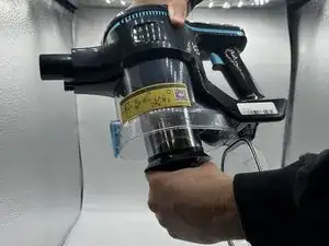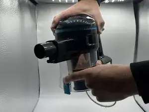 Нажмите на синюю кнопку открытия, чтобы отделить основной блок двигателя от остальной части пылесоса.