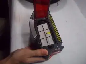Когда контейнер для грязи полностью отделен от Roomba, нажмите на вкладку, которая находится справа от вас.