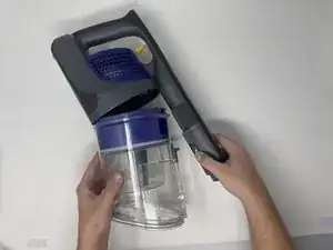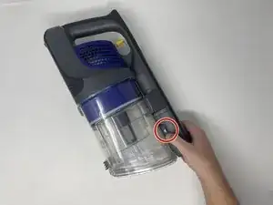 Снимите основание ручки с основной части пылесоса для более удобного обращения. Нажмите на индиговую кнопку и сдвиньте основание ручки от основной части пылесоса.