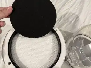 Удалите контейнер для доступа к двум губчатым фильтрам и HEPA-фильтру.