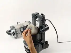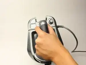 Нажмите серебристый фиксатор и отведите блок от корпуса пылесоса снизу.
