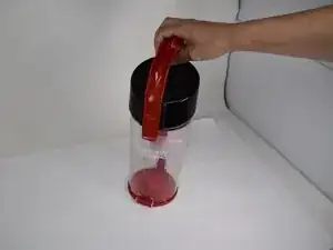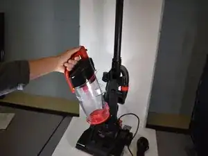 Снимите контейнер с пылесоса, нажав на красный язычок и подняв его вверх.