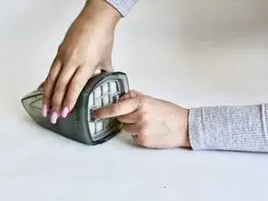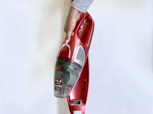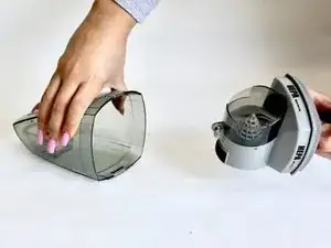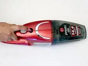Нажмите на серую кнопку освобождения ручного пылесоса, расположенную прямо под кнопкой питания, чтобы освободить контейнер для пыли.