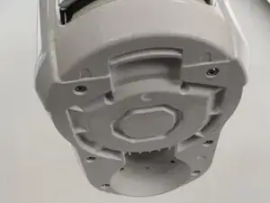 Снимите красную крышку с передней части пылесоса, потянув за защелку, расположенную в нижней части крышки, вперед и опустив всю крышку вниз.
