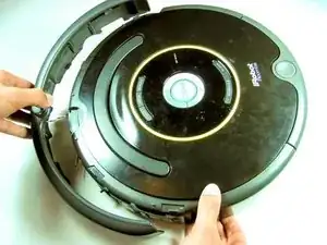 Снимите передний бампер. Его можно снять вручную или инструментом. Он должен отщёлкнуться с некоторым усилием. Бампер по-прежнему будет соединён с Roomba парой проводов.
