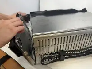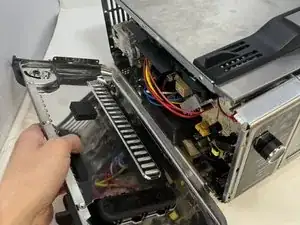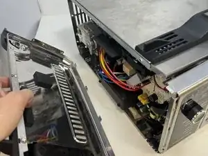 Снимите боковую панель с блоком управления. Для её снятия нажмите вперед в направлении передней панели управления, чтобы освободить зацепы из корпуса. Отогните боковую панель, когда зацепы визуально выйдут из своих посадочных мест в корпусе.