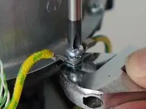 Используйте отвёртку PH2 и разводной ключ (или гаечный ключ 5.5 мм), чтобы снять винт, крепящий заземляющие проводники к камере нагревательного элемента.