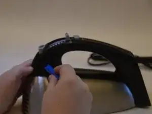 Используйте пластиковый инструмент для вскрытия, чтобы снять крышку рукоятки: ослабьте оба конца, затем сдвиньте инструмент к середине рукоятки.