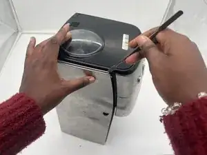 Вставьте металлическую лопатку между металлической пластиной и пластиковым корпусом кофеварки и снимите металлическую пластину.
