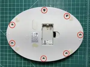 Установите верхнюю часть корпуса на место, придерживая верхнюю и нижнюю части вместе, переверните весы и вставьте обратно семь винтов. Не перетягивайте. Установите весы в вертикальное положение.