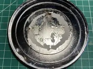 Несмотря на металлический вид, пластина покрыта хромированным слоем пластика. На её нижней стороне имеются четыре зацепа, которые фиксируют её к нижележащей детали, а также слой клея (на фото — розового цвета).