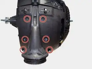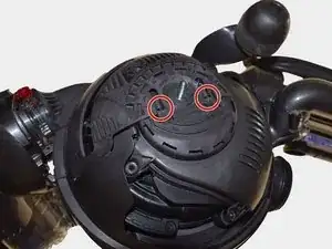 Выкрутите четыре серебристых винта T-10 длиной 10 мм снизу шарового соединения пылесоса и два нижних серебристых винта T-15 длиной 15 мм.