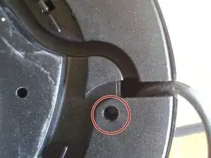 Переверните машину вверх дном и отвинтите винт T10 прямо рядом с сетевым шнуром