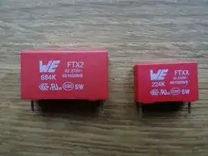 Конденсаторы замены имеют очень короткие проводки. Поэтому 680 нФ конденсатор был обрезан, чтобы его можно было подключить в горизонтальном положении.