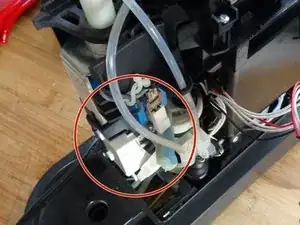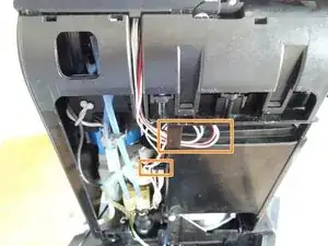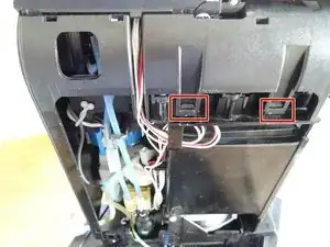 Пластиковая крышка над узлом заваривания закреплена двумя зажимами с каждой стороны. Используйте металлическую лопатку, чтобы открепить их.