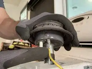 Наденьте чёрный провод на новый поджигатель и подключите жёлтый провод заземления к контактной точке на конфорке до плотного закрепления обоих соединений.