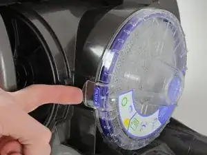 Найдите защёлку крышки постфильтра и оттяните её от основания пылесоса, чтобы освободить верхнюю часть.