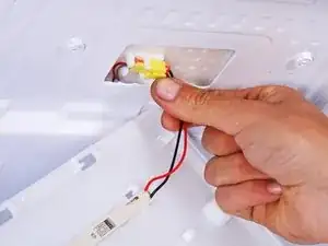 Пока не пытайтесь полностью снять панель лампы — она соединена с холодильником кабелем.