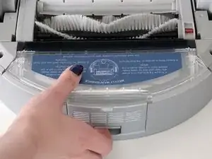 Далее извлеките пылесборник. Удерживайте кнопку на задней стороне контейнера и потяните, чтобы снять его.