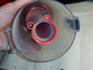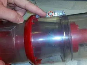Сняв дверцу на петлях, загляните в пылесборник и найдите два винта, удерживающие циклонный воронкообразный элемент.