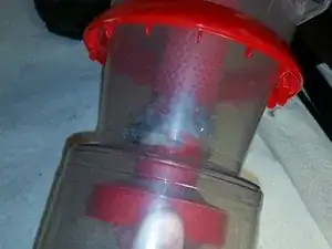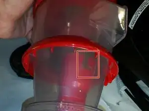 Крепко возьмите коллектор пыли рукой, найдите механизм поворотной блокировки, который соединяет его с вершиной пылесборника.