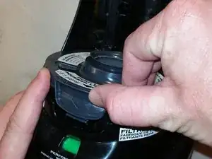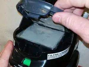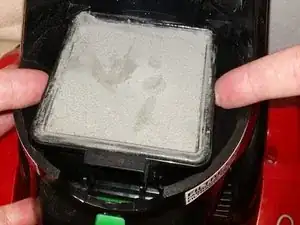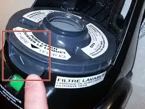 В нижней части теперь пустого отсека для пылесборника найдите узел фильтра и кожух. Он расположен прямо над «Индикатором производительности»