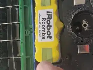 Поднимите жёлтый аккумулятор, потянув вверх зелёные защёлки на его боковой стороне.