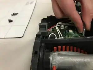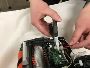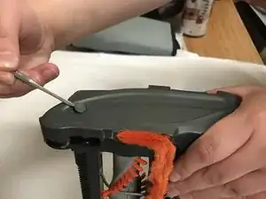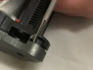 Используйте крупный пластиковый инструмент для вскрытия, чтобы оттянуть резиновый ремень щеточного вала на себя, пока он не снимется с маленькой металлической шестерни.