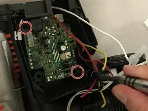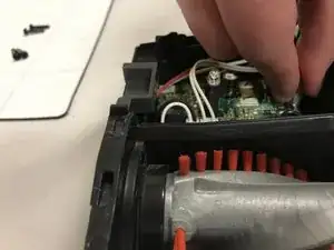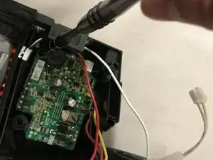 Сожмите защёлки и снимите маленькую белую вилку с выходящими белым и чёрным проводами.