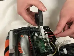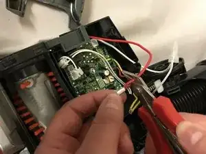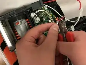Сожмите три пластиковые крышки, охватывающие опрессованное соединение красного, чёрного и жёлтого проводов, чтобы освободить провода из зажима пластиковых крышек.