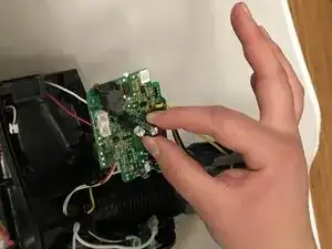 Сожмите защёлки и снимите маленькую белую вилку с двумя выходящими белыми проводами.