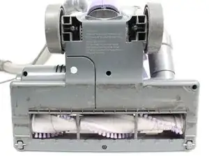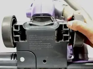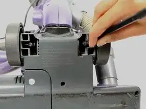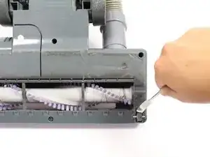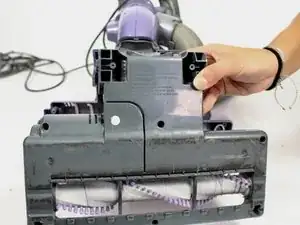 Положите пылесос на бок, чтобы получить доступ к нижней панели отсека роликовой щётки.