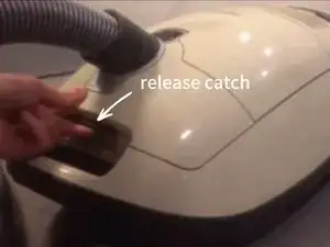 Нажмите на защелку возле ручки, чтобы открыть крышку. Для лучшего доступа вы можете отсоединить всасываюющий шланг перед открытием.