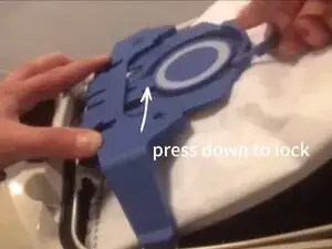 Возьмите новый мешок Miele GN, выровняйте стрелки с держателем и нажмите вниз, пока не услышите щелчок. 👉 Убедитесь, что мешок полностью закреплен — если нет, отверстие может не совпасть с шлангом, что приведет к утечке пыли наружу во время использования.
