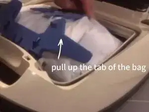 Подтяните за маленькую синюю пластиковую петлю, чтобы освободить полный мешок из держателя. Не беспокойтесь — мешки Miele GN автоматически запечатываются при снятии, удерживая пыль внутри.