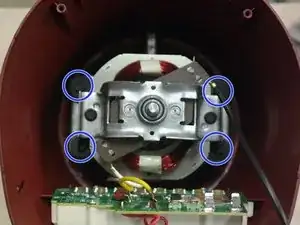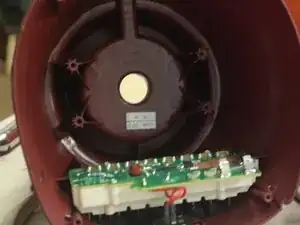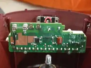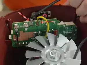 После снятия основания вы увидите зелёную плату управления панели. К плате подсоединены жёлтый и чёрный провода. Эти провода необходимо отсоединить, чтобы извлечь мотор.