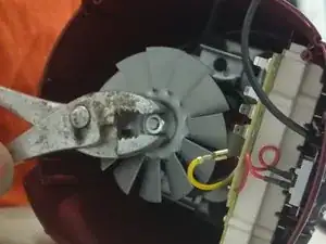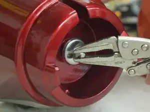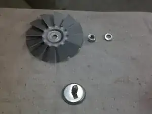 Используя другую пару плоскогубцев, вращайте болт, фиксирующий крыльчатку вентилятора, удерживая шпиндель зажатыми тисками. Отвинтите этот болт и снимите крыльчатку вентилятора, шайбу и шпиндель.