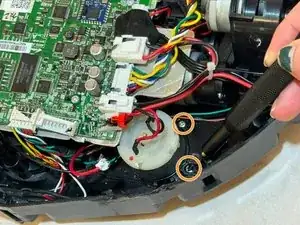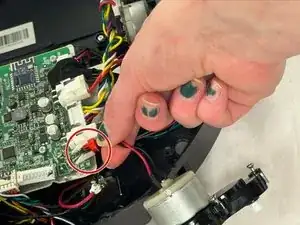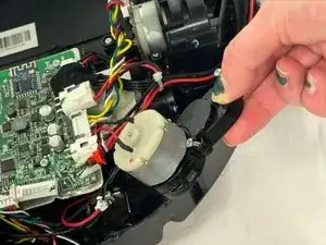 Поднимите мотор боковой щётки, чтобы получить доступ к красному разъёму JST и белой защёлке.