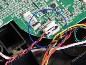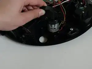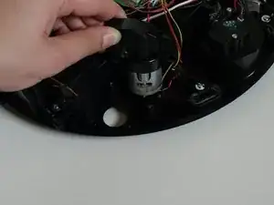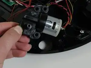 Мотор боковой щётки соединён с платой одним красным и одним чёрным скрученным проводом. Нажмите вниз на маленькую белую защелку и потяните, чтобы отключить его от основной платы.