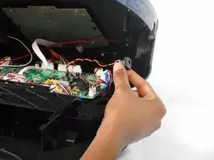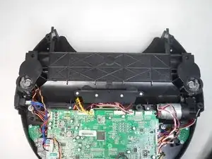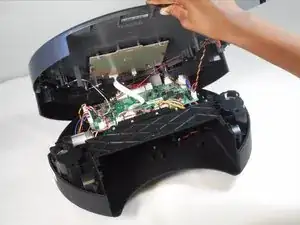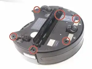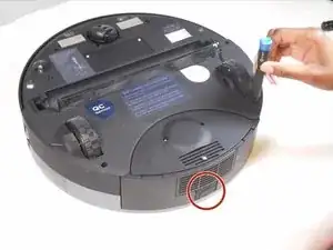 Удалите два винта (9.9 мм, Phillips #1) под колёсами по обе стороны от отсека контейнера для пыли.