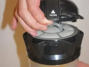 Нажмите на белую сетку, сегмент под ручкой фильтра, вниз, чтобы она выскочила из серого держателя фильтра. Это удалит фильтр.