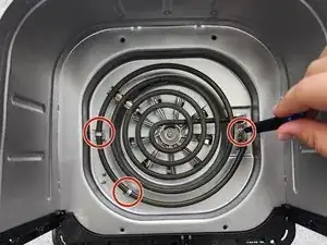 Удалите 3 винта внутри камеры приготовления, которые удерживают нагревательный элемент на месте, с помощью отвертки Philips #2.