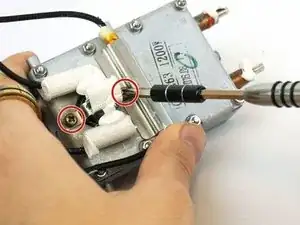 Снимите два винта Phillips #2 длиной 12,0 мм, которые крепят шнур питания к устройству.