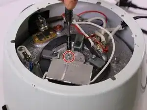 Отверните винт с крестообразным шлицем 7 мм, удерживающий белый провод, подключённый к нагревательному элементу.