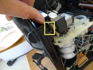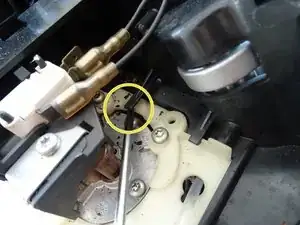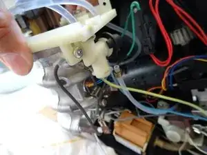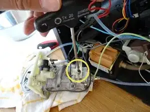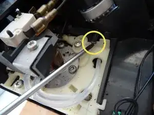 На этом этапе нужно отсоединить связь между рукояткой пара и паровым клапаном. Кнопка имеет два штыря, вставленных в круглую пластину с крестообразным надрезом. У парового клапана также есть два штыря, которые входят в эту пластину с другой стороны.