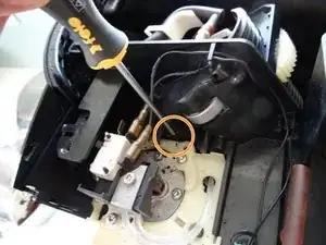 Кронштейн картриджа удерживается двумя чёрными пластиковыми рамками. Подденьте его отвёрткой вверх, пока кронштейн не освободится.