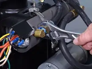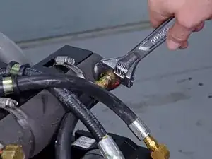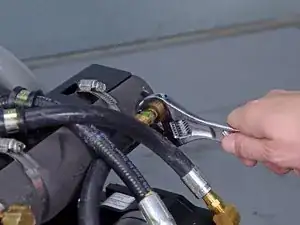 Используйте разводной ключ, чтобы ослабить фитинг впускного водяного шланга на нагревателе размером 9/16 дюйма.