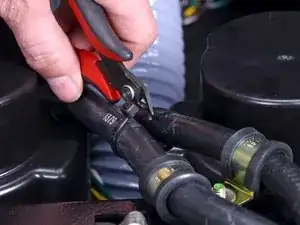 Используйте кусачки вровень или острые ножницы, чтобы перерезать стяжку, связывающую два шланга вместе.