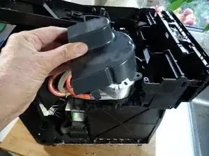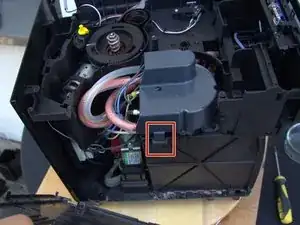 Нагреватель жидкости теперь хорошо виден. Он все еще скрыт под серой пластиковым крышкой. Крышка крепится с помощью двух защелок. Задняя защелка немного трудно доступна.